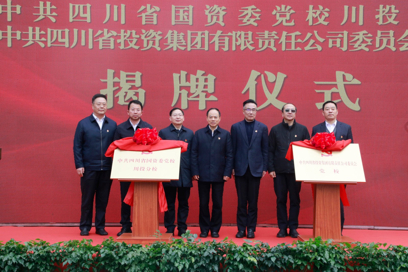 揭牌儀式上,熊偉、肖敬軍、任興文、吳曉曦共同為省國(guó)資委黨校川投分校、川投集團(tuán)黨校揭牌。