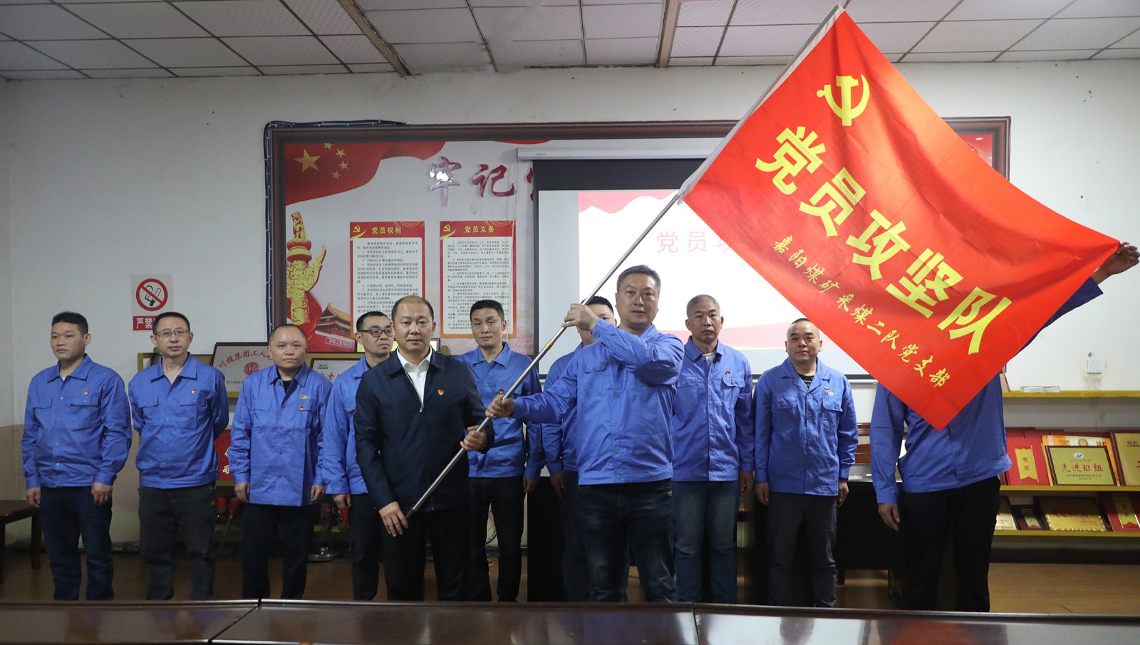 4月25日,嘉陽煤礦采煤二隊(duì)黨支部在黨群活動(dòng)室舉行“黨員攻堅(jiān)隊(duì)”授旗儀式,公司黨委副書記、總經(jīng)理范勤英授予黨支部“黨員攻堅(jiān)隊(duì)”旗幟,鼓勵(lì)黨員干部帶領(lǐng)全隊(duì)職工緊跟新質(zhì)生產(chǎn)力發(fā)展步伐,進(jìn)一步挖掘智能化綜采優(yōu)勢(shì),確保生產(chǎn)安全高效。