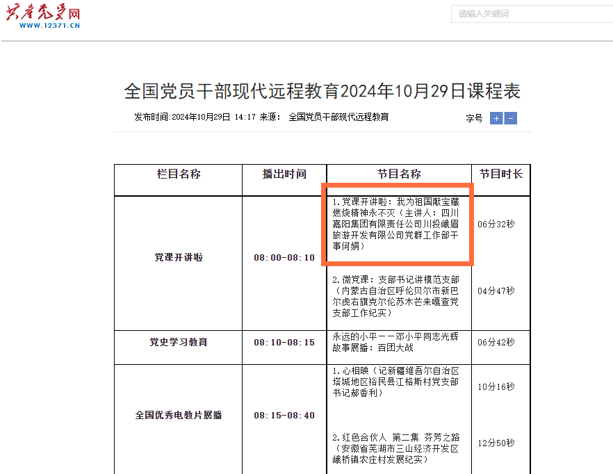 10月29日,由中共中央組織部主管、中央組織部黨員教育中心主辦的共產(chǎn)黨員網(wǎng)公布全國黨員干部現(xiàn)代遠程教育課程表,集團公司微堂課《我為祖國獻寶藏 燃燒精神永不滅》精彩亮相,用6分32秒的時長為全國的黨員們呈現(xiàn)了難忘的一課。